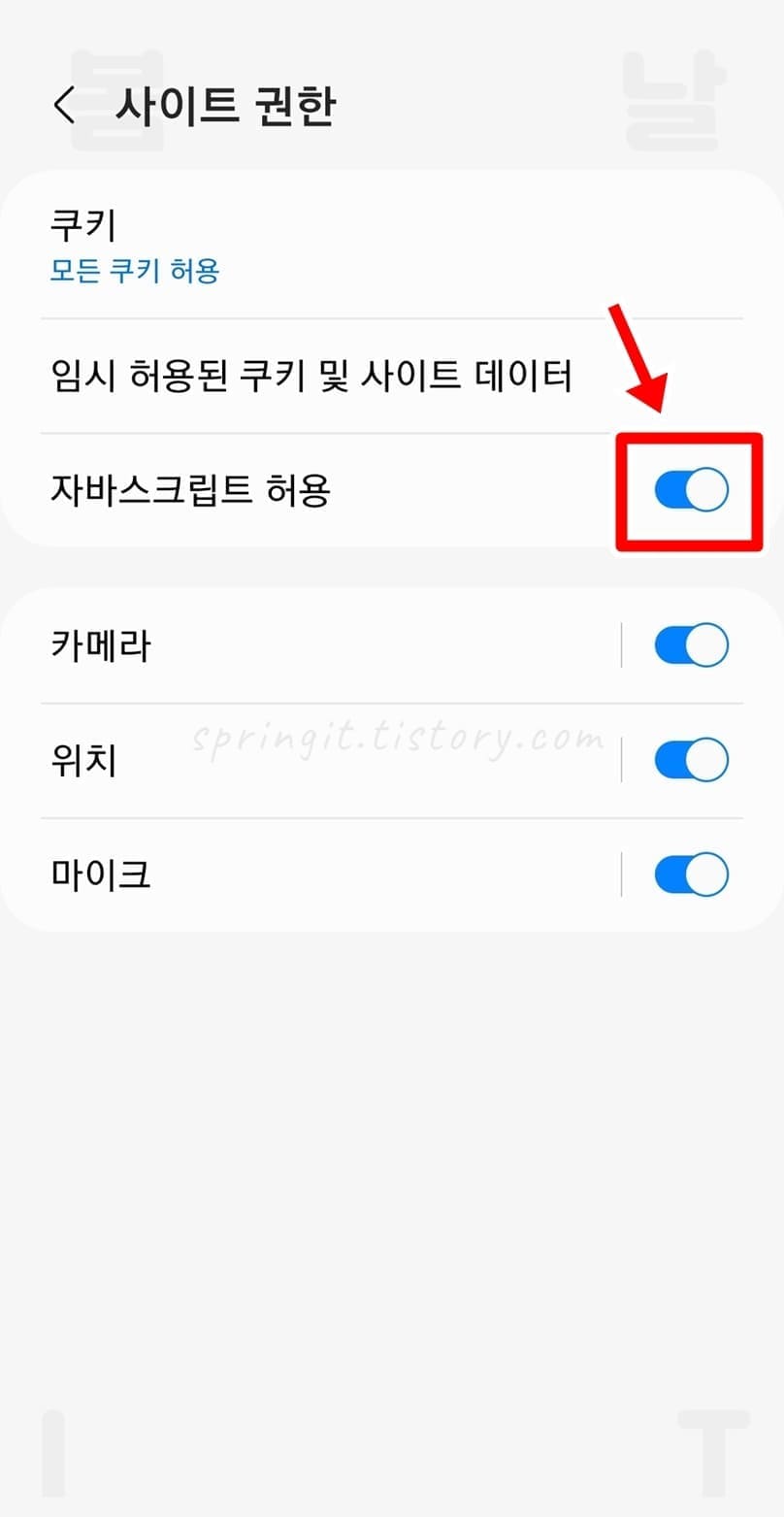 6. 자바스크립트 허용을 활성화하면 팝업 차단 해제됩니다.