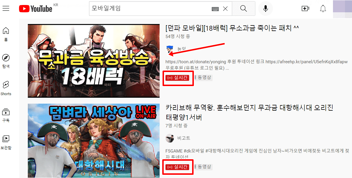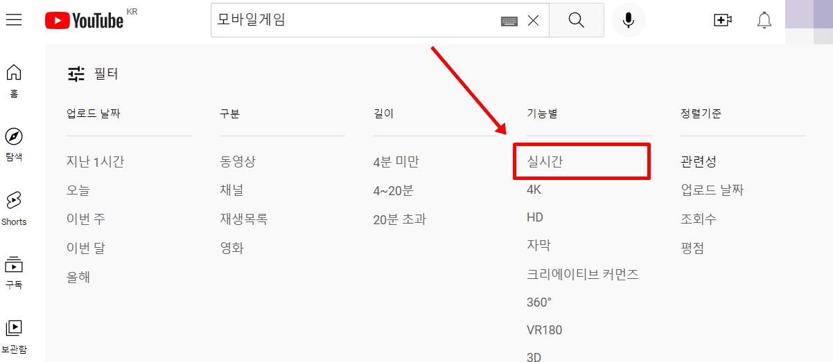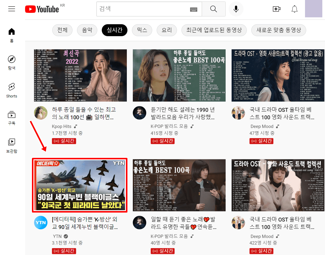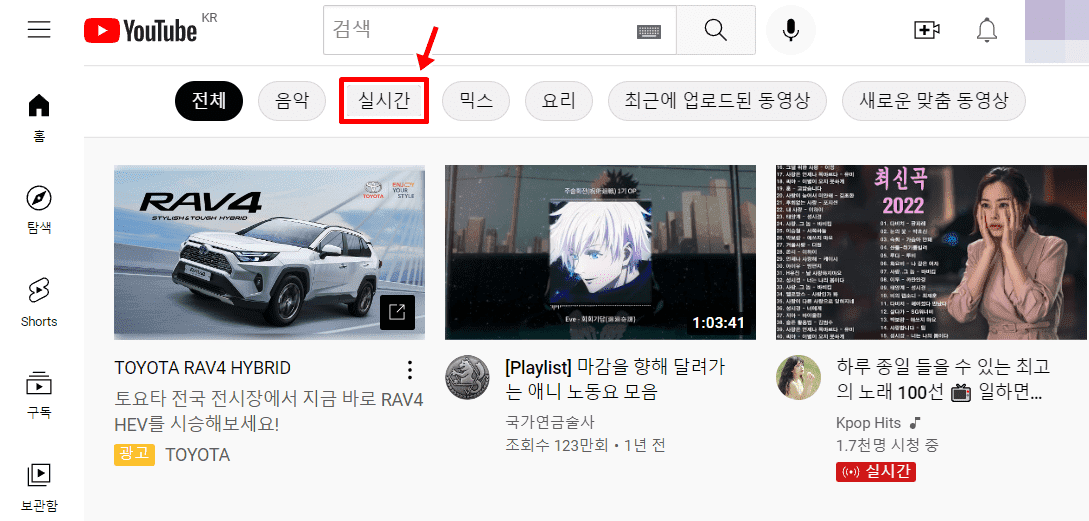 위의 실시간 메뉴에서는 모든 주제의 유튜브 라이브 방송 목록을 보여주는데요. 그래서 내가 관심있는 주제의 라이브 방송을 찾기가 상당히 힘듭니다. 이럴 때에는 검색을 통해서 내가 보고 싶은 주제의 라이브 방송의 목록만 확인해보시길 바랍니다.