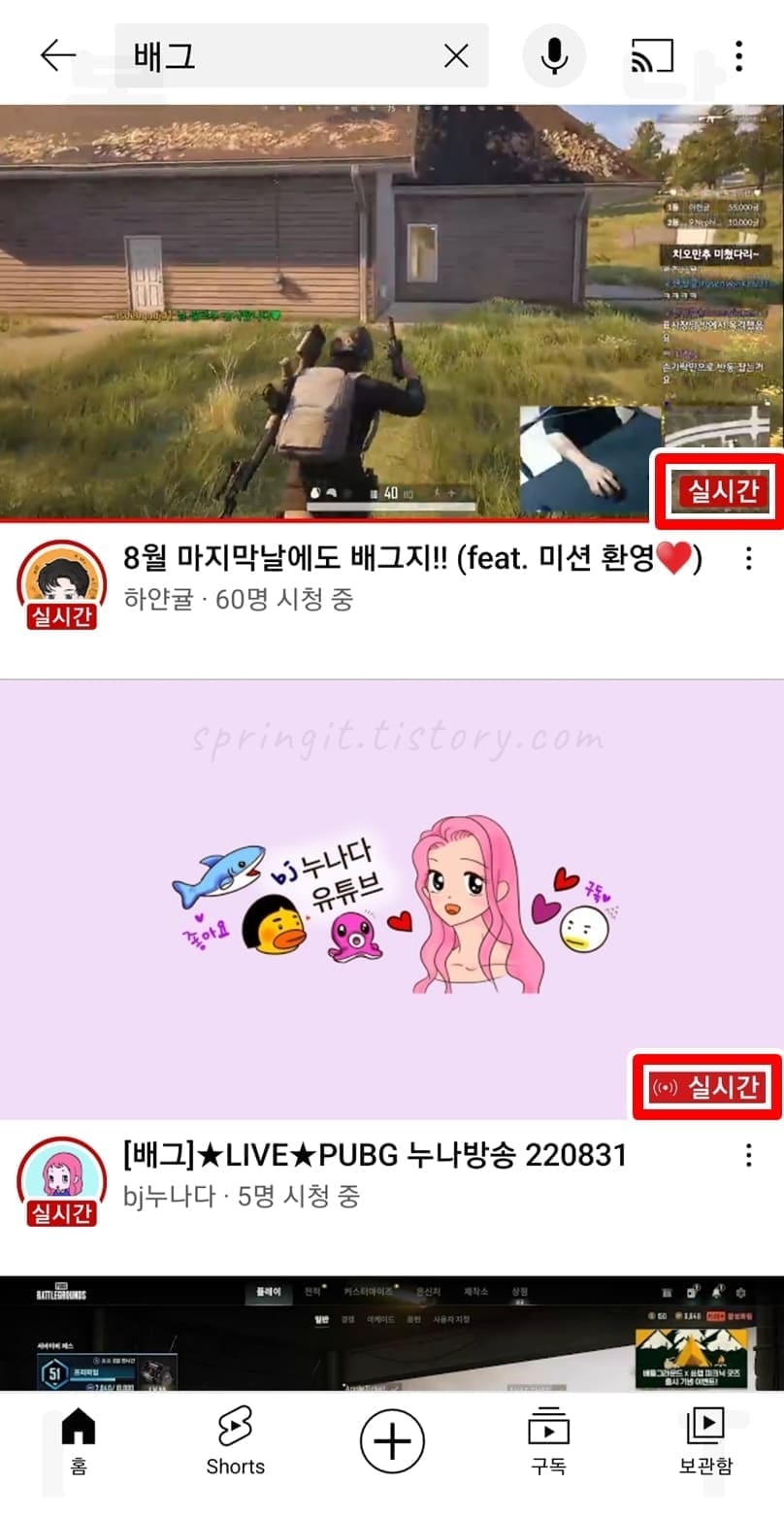 동영상 썸네일 우측 하단에 실시간 표시로 라이브 스트리밍임을 확인할 수 있습니다.