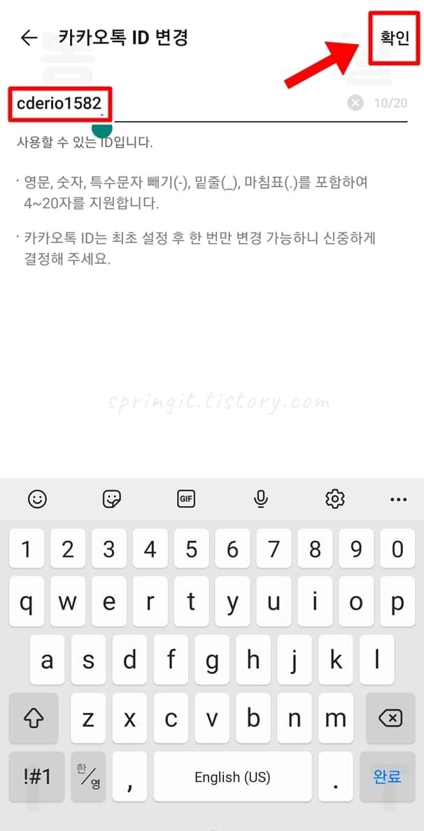 소개드린 위 과정이 가장 쉬운 카카오톡 아아디 확인 및 변경 방법입니다. 참고로 아이디 변경은 영문, 숫자, 특수문자 뺴기, 밑줄, 마침표를 포함해서 4~20자로 만들 수 있으니 신중하게 변경해보세요.