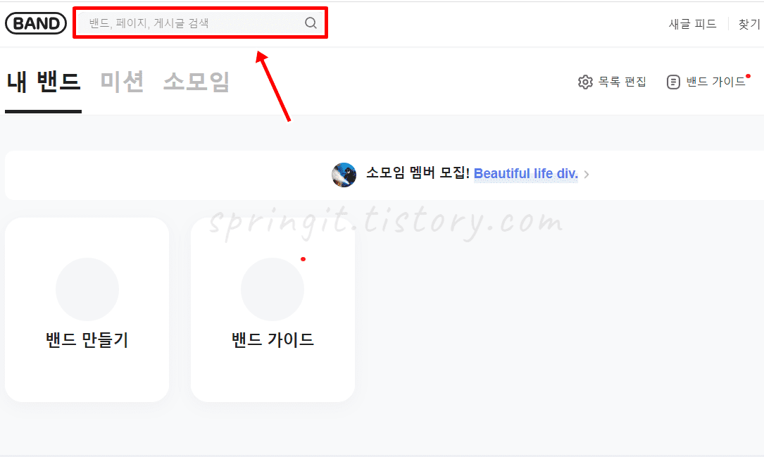 6. 로그인된 밴드에서 상단 검색창을 클릭합니다.