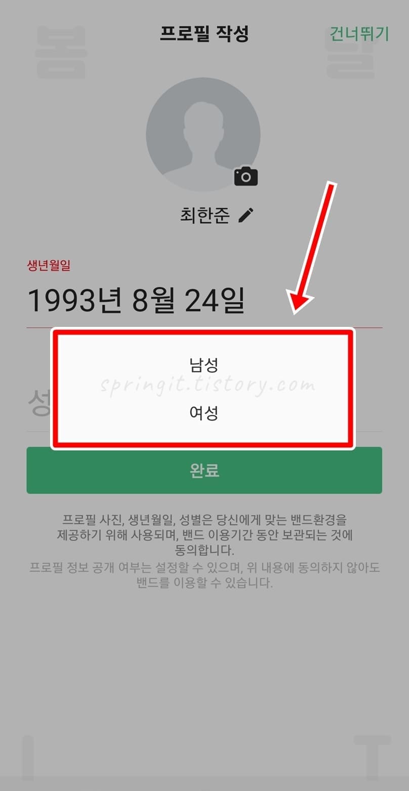 10. 밴드 프로필 생성 화면에서 성별을 누릅니다.