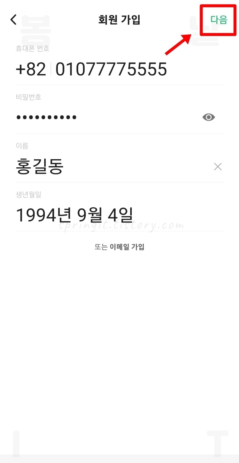 5. 휴대폰번호, 비밀번호, 이름, 생년월일을 입력합니다.