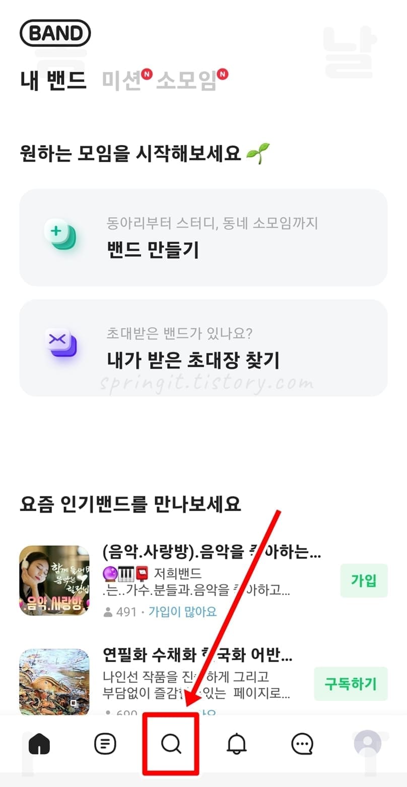 1. 밴드 앱에서 검색 버튼을 클릭합니다.