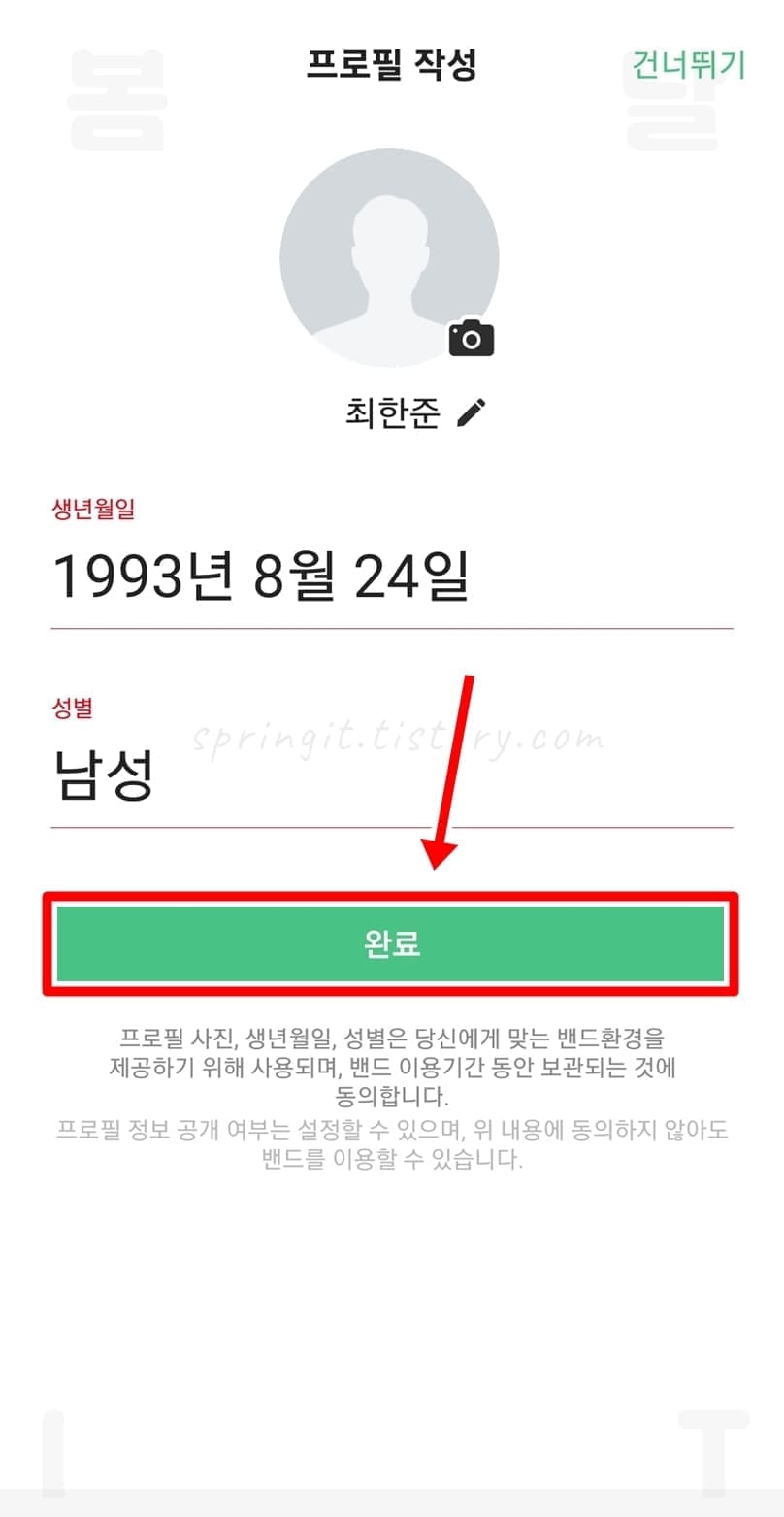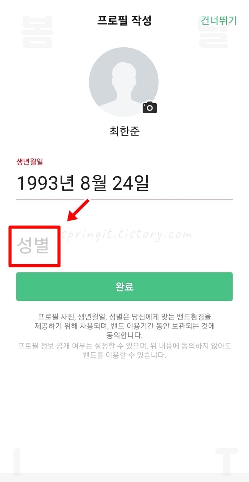 이름과 생년월일은 이전 개인정보 입력창을 바탕으로 자동 입력되어 있습니다. 그러나 혹시 이름이나 생년월일이 맞지 않다면 클릭해서 수정할 수 있습니다. 또 이곳에서 프로필 사진을 미리 설정해둘 수도 있으니 밴드에서 활동할 내 프로필을 미리 꾸며보세요.