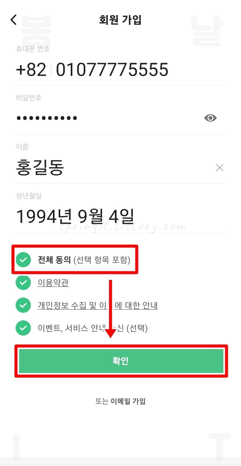 7. 약관 전체 동의에 체크하고 확인을 누릅니다.