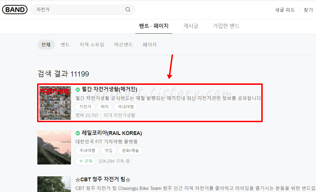 8. 검색 결과에서 가입하고 싶은 밴드를 선택합니다.