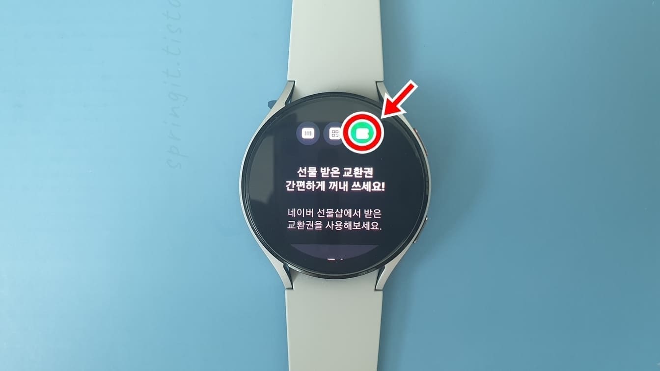 갤럭시워치에서 선물 받은 교환권 사용 방법: 갤럭시워치 실행 > 우측 상단 버튼 클릭 > 교환권 확인 후 사용