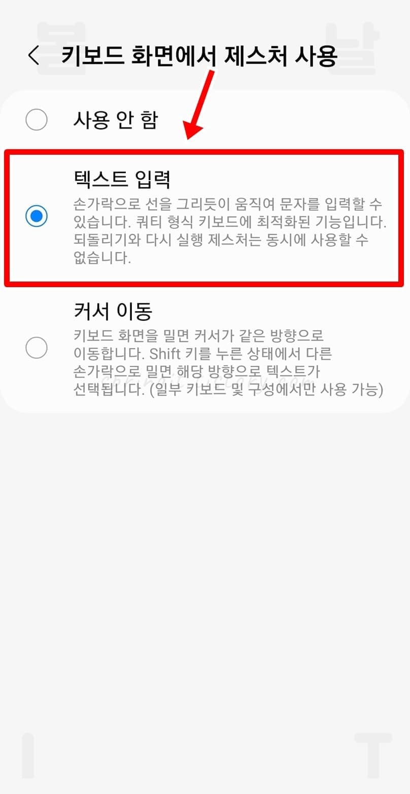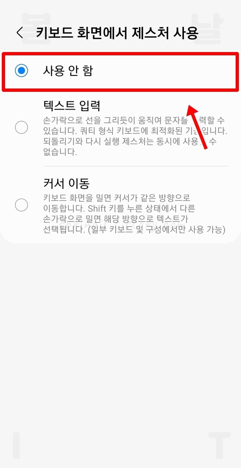 - 사용 안 함: 갤럭시 키보드를 길게 눌러도 제스처 선이 나오지 않습니다.