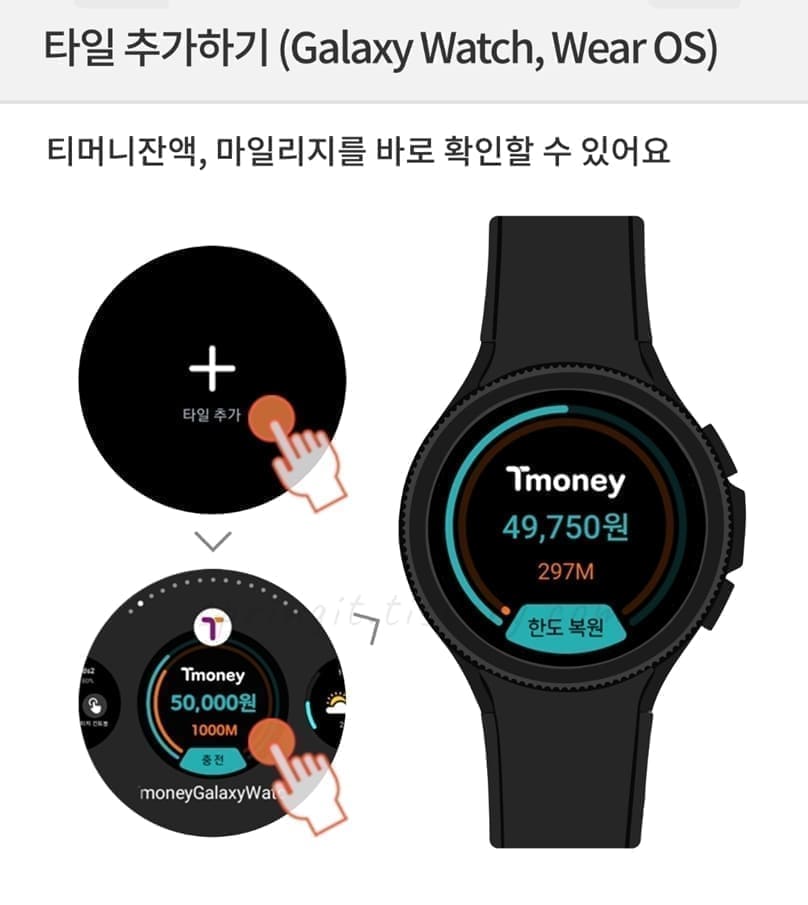 - 갤럭시워치에 티머니 앱을 타일 추가해보세요.