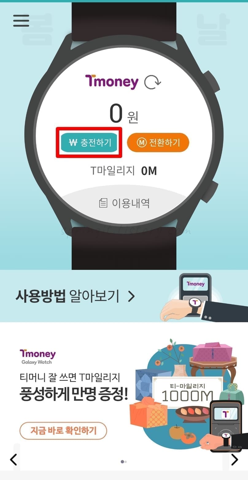 - 일반 티머니(플라스틱)와 티머니 갤럭시워치는 서로 다른 카드로 잔약 연동이 불가합니다.