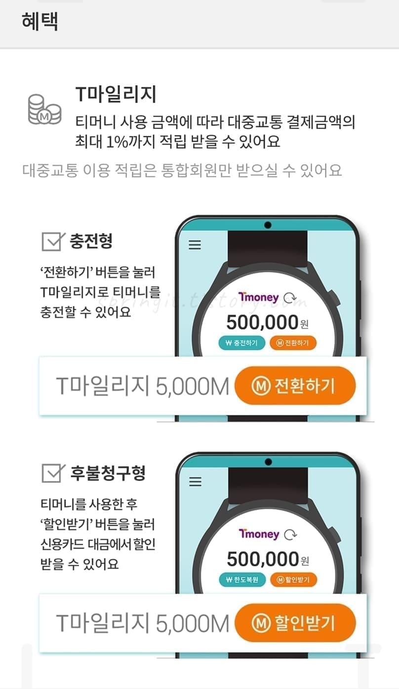 T마일리지는 티머니 사용 금액에 따라 대중교통 결제금액의 최대 1%까지 적립 받을 수 있습니다. 충전형의 경우 '전환하기'버튼을 눌러서 T마일리지로 티머니를 충전할 수 있습니다. 후불청구형의 경우 티머니를 사용한 후 '할인받기' 버튼을 눌러 신용카드 대금에서 할인 받을 수 있습니다.