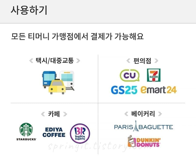 - 티머니 가맹점 또는 교통카드 단말기에서만 사용이 가능합니다.