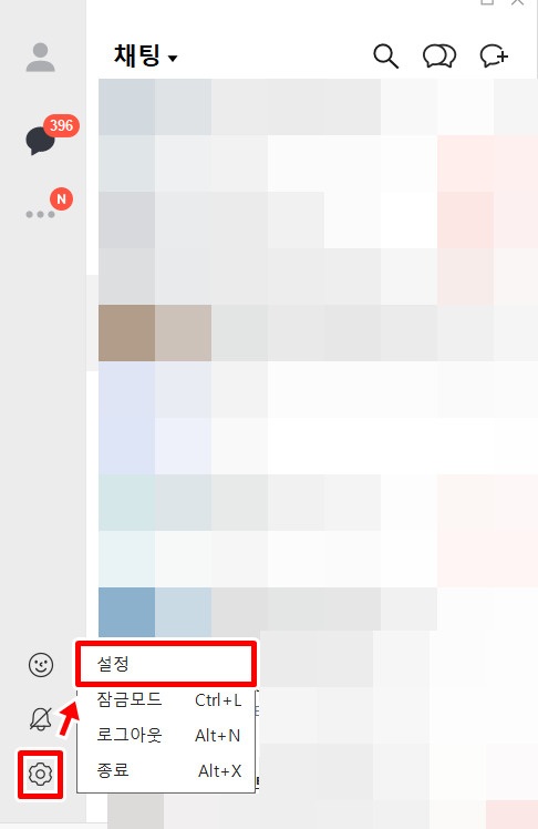 1. 카톡 PC버전에서 톱니바퀴 버튼 > 설정을 클릭합니다.