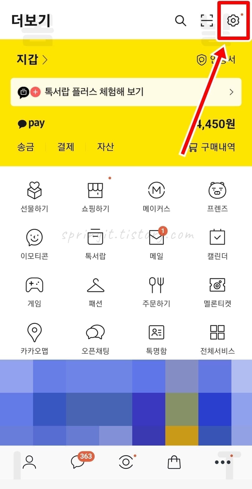 1. 카톡 PC버전에서 톱니바퀴 버튼 > 설정을 클릭합니다.