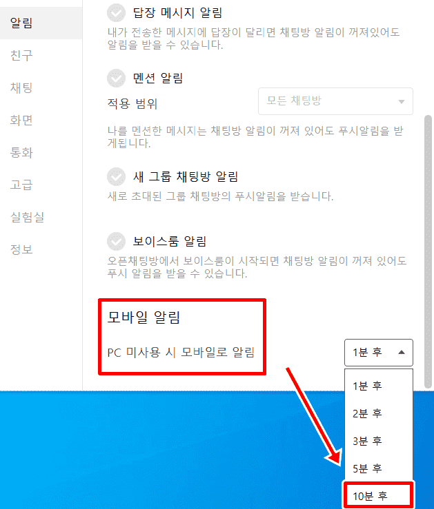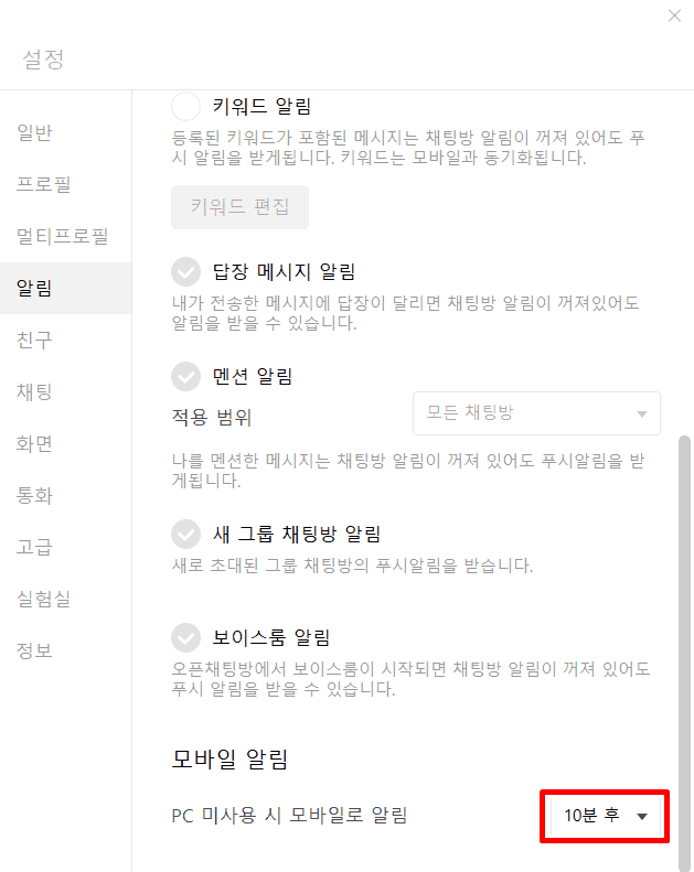 카카오톡 PC 미사용 시 모바일로 알림되는 시간 늘리기