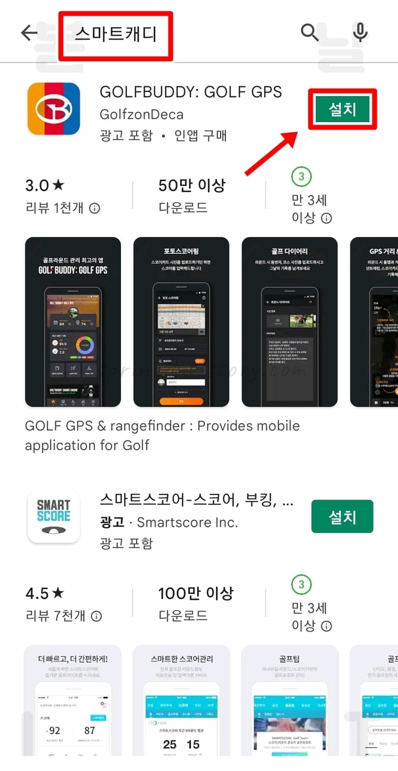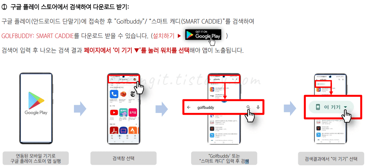 1. 구글 플레이(안드로이드 단말기)에 접속한 후 "Golfbuddy"/"스마트캐디(Smart Caddie)"를 검색하여 앱을 설치합니다.