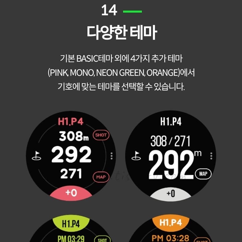 기본 BASIC테마 외에 4가지 추가 테마(핑크, 모노, 네온그린, 오렌지)에서 기호에 맞는 테마를 선택할 수 있음.