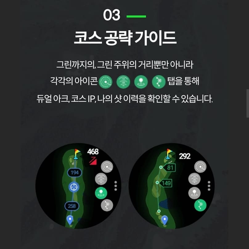 그린까지의, 그린 주위의 거리뿐만 아니라 각각의 아이콘 탭을 통해 듀얼 아크, 코스 IP, 나의 샷 이력을 확인