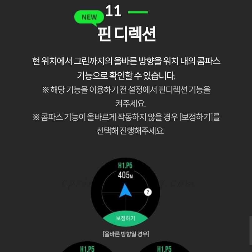 현위치에서 그린까지의 올바른 방향을 워치내 콤파스 기능으로 확인할 수 있음.
