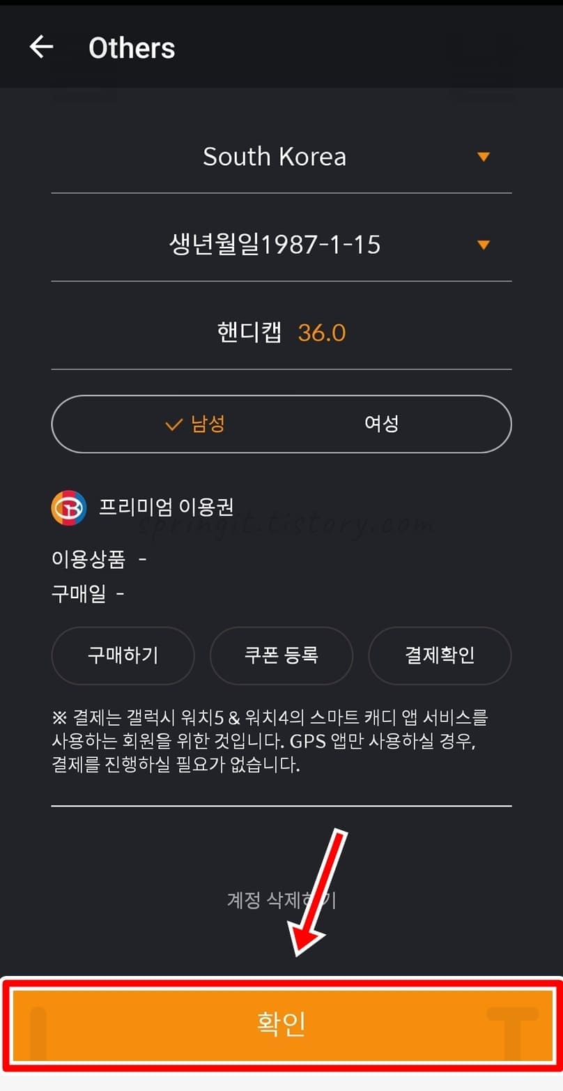 국가, 생년월일, 핸디캡, 생년월일 및 프리미엄 이용권(갤럭시워치 스마트캐디 서비스 사용하는 회원을 위한 것으로 GPS 앱만 사용할 경우 결제를 진행할 필요는 없습니다.)을 설정합니다.