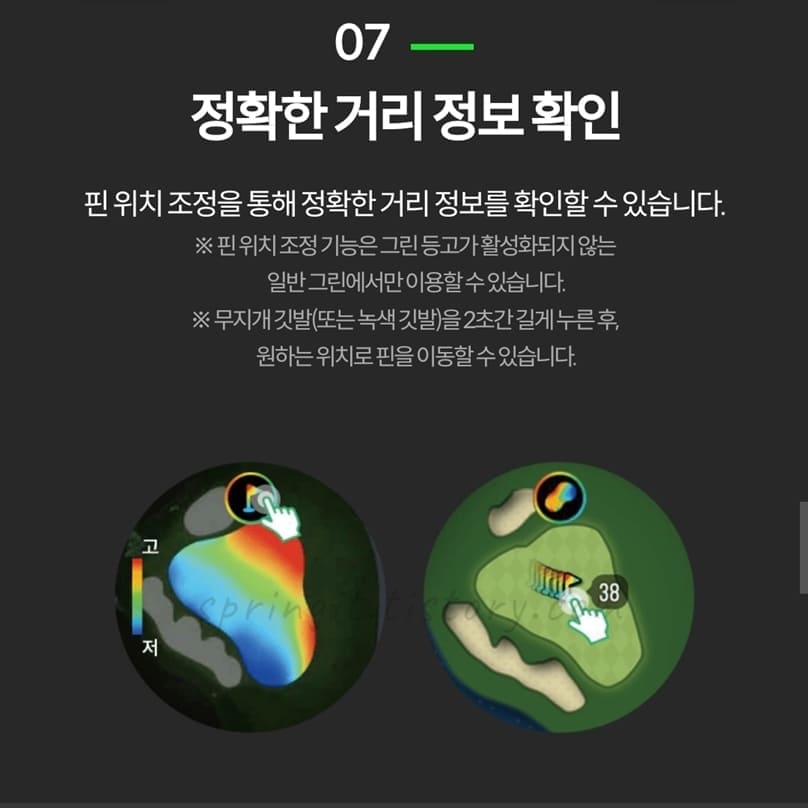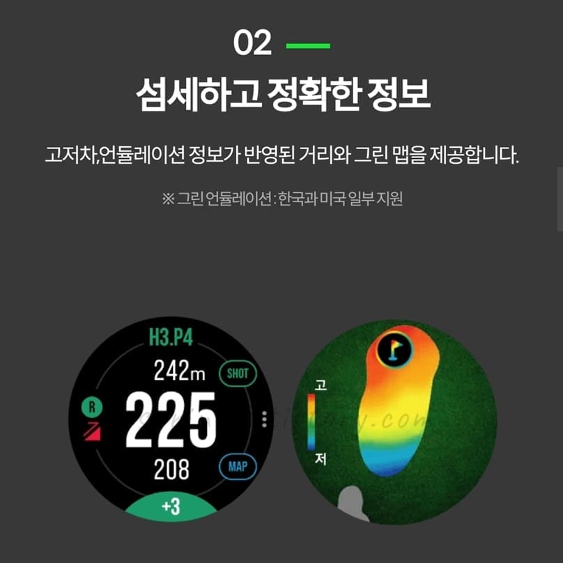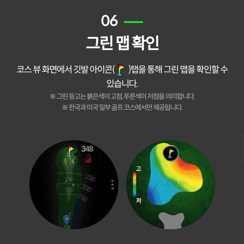 ※그린 등고는 붉은색이 고점 푸른색이 저점을 의미함. 한국과 미국 일부 골프 코스에서만 제공됨.