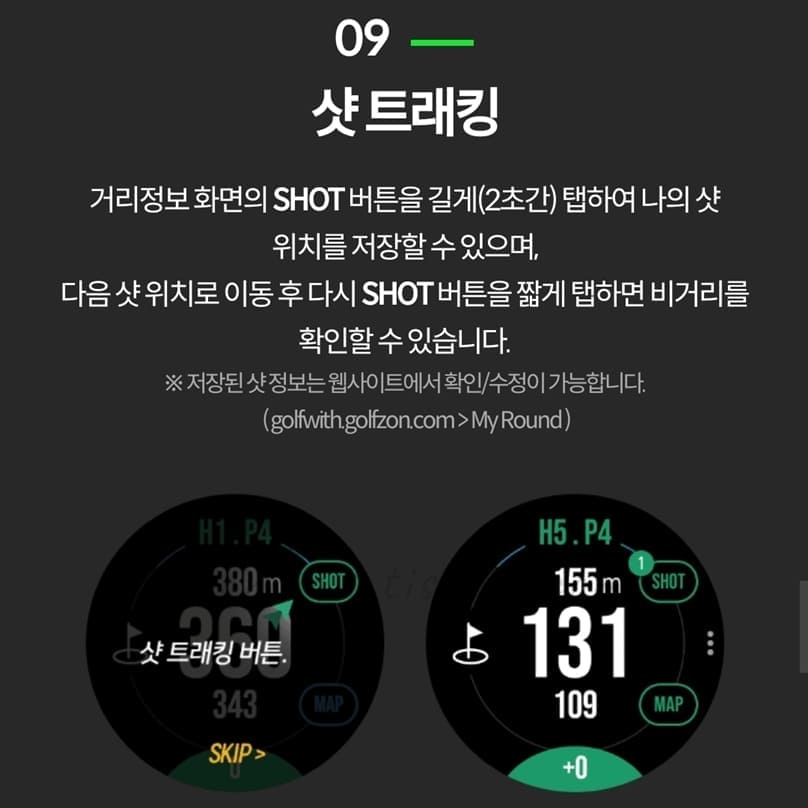 거리정보 화면의 SHOT 버튼을 길게(2초간) 탭하여 나의 샷 위치를 저장할 수 있고 다음 샷 위치로 이동 후 다시 SHOT 버튼을 짧게 탭하면 비거리를 확인할 수 있음.