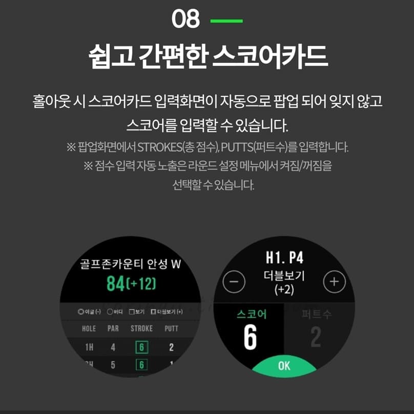 홀아웃시 스코어카드 입력화면이 자동으로 팝업되어 잊지 않고 스코어를 입력할 수 있음.