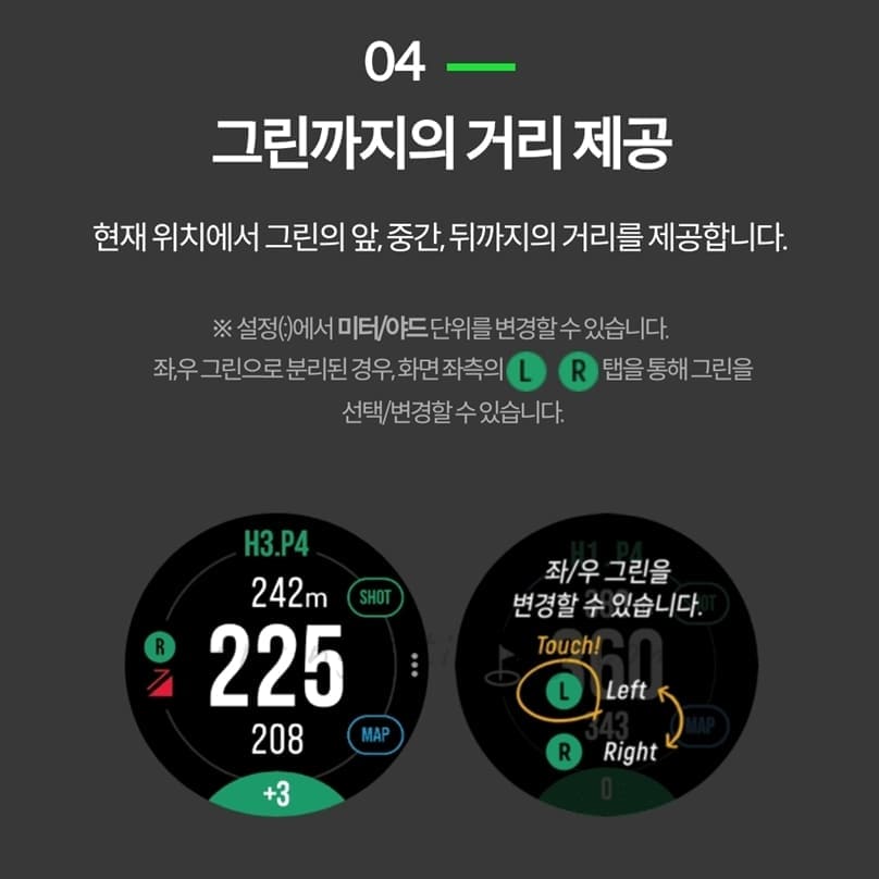 ※ 설정에서 미터/야드 단위를 변경할 수 있고 좌우 그린으로 분리된 경우 화면 좌측의 L/R 탭을 통해 그린을 선택/변경할 수 있습니다.