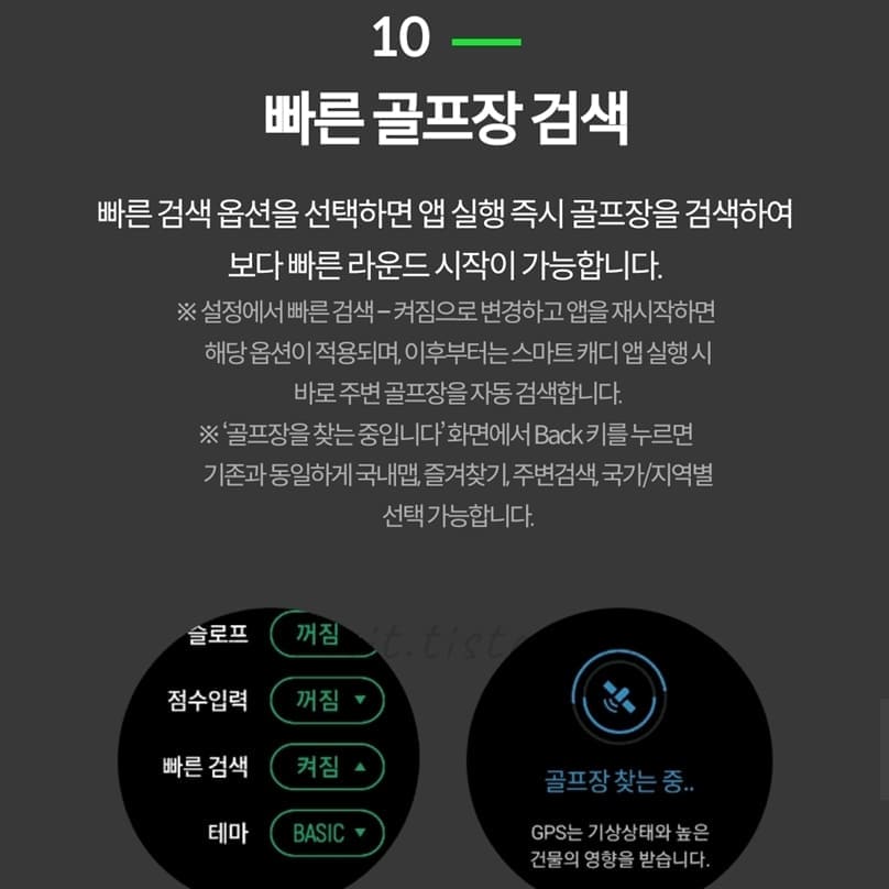 ※설정에서 빠른 검색 - 켜짐으로 변경하고 앱을 재시작하면 해당 옵션이 적용되며 이후부터는 갤럭시워치 스마트캐디 앱 실행시 바로 주변 골프장을 자동 검색함.