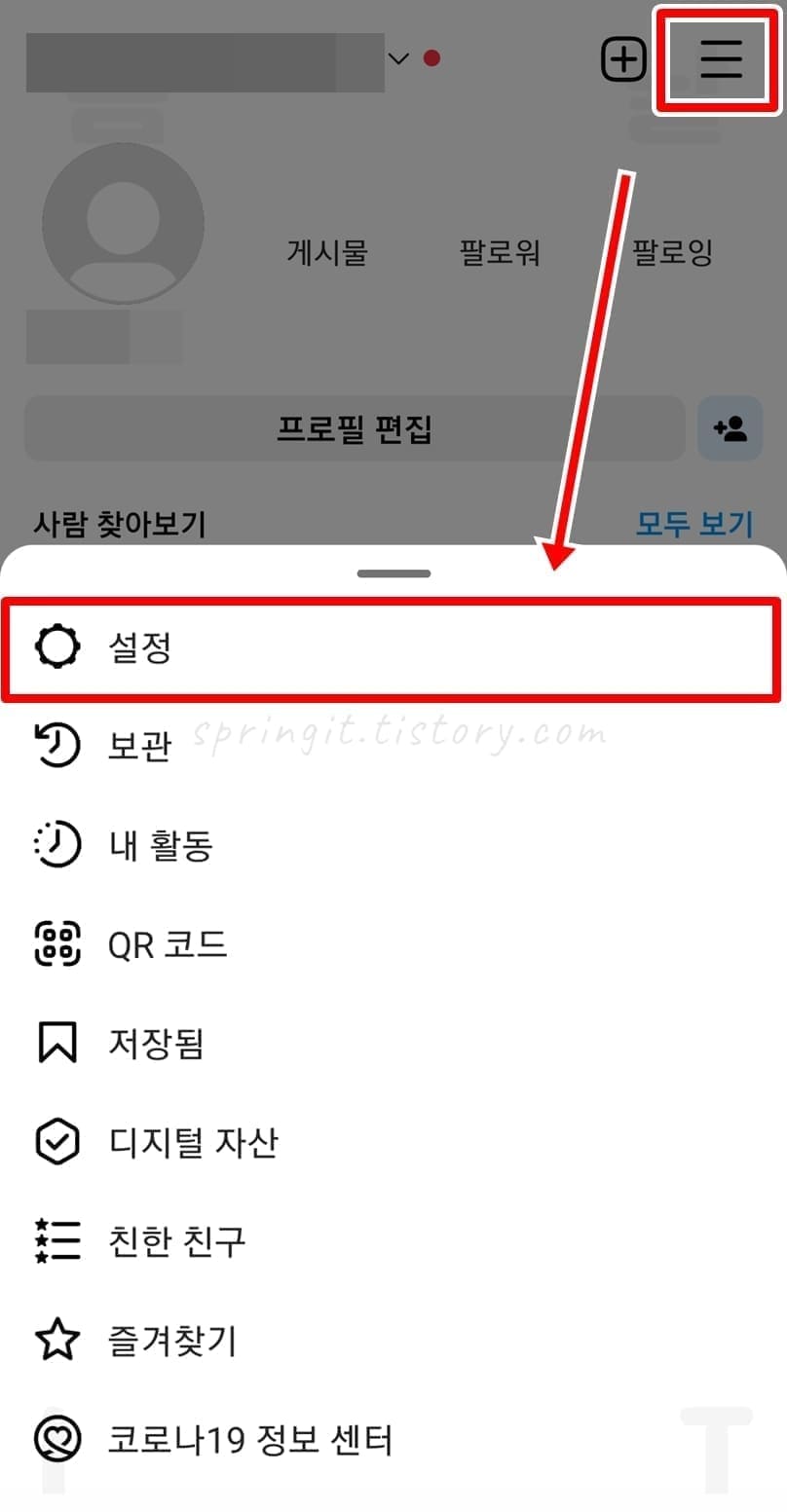 1. 내 프로필 화면 > 더보기 메뉴 > 설정을 클릭합니다.
