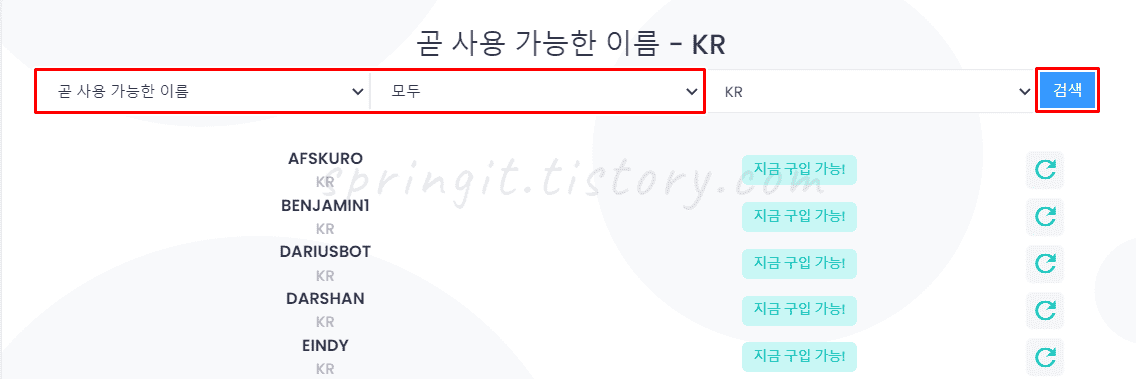 ▲ 목록에서는 곧 사용한 가능한 닉네임에서 필터로 숫자, 문자로 변경한 후 검색을 하면 변경할 수 있는 닉네임들을 한눈에 모두 확인할 수 있습니다.