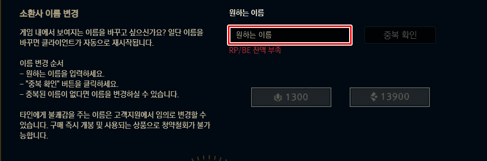 RP는 1300, BE는 13900이 필요하니 꼭 변경전에 모아두시길 바랍니다. 또 레어닉네임이더라도 타인에게 불쾌감을 주는 이름은 고객지원에서 임의로 변경할 수 있으니 조심하셔야 합니다. 롤 실사용 유저들이 레어 닉네임을 많이 갖게 되길 바라면서 글을 마치도록 하겠습니다.