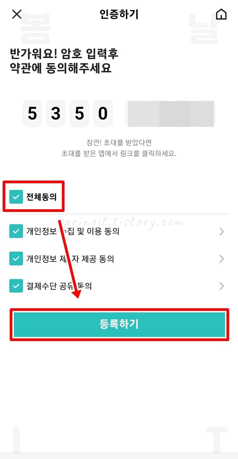6. 연결된 화면에서 약관전체 동의 후 등록하기를 클릭합니다.