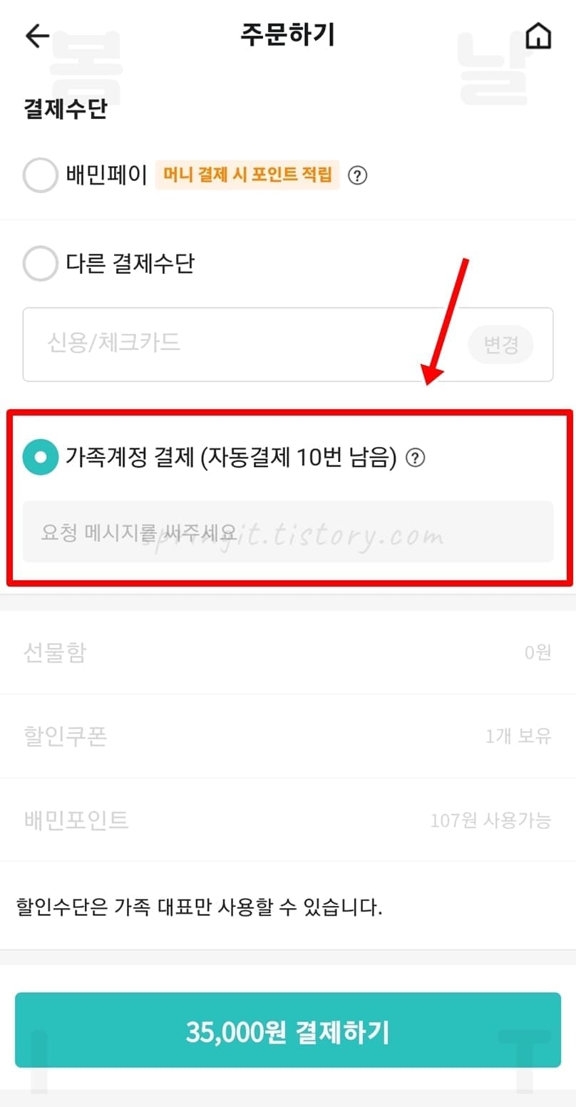 2. 결제화면에서 결제수단 - 가족계정 결제를 선택합니다.