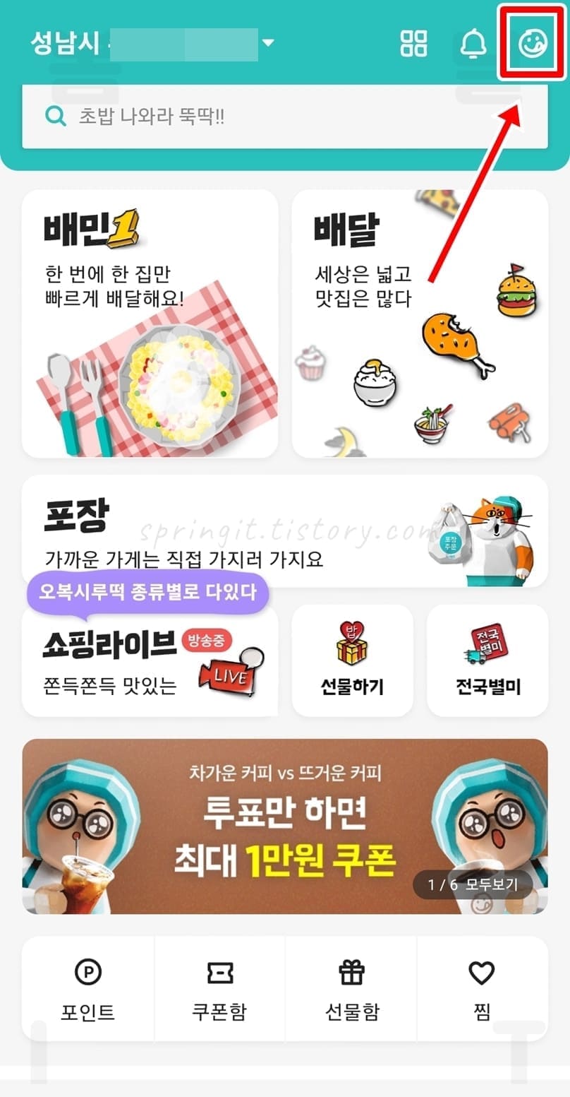 1. 배달의민족 앱 실행 후 MY배민 버튼을 클릭합니다.