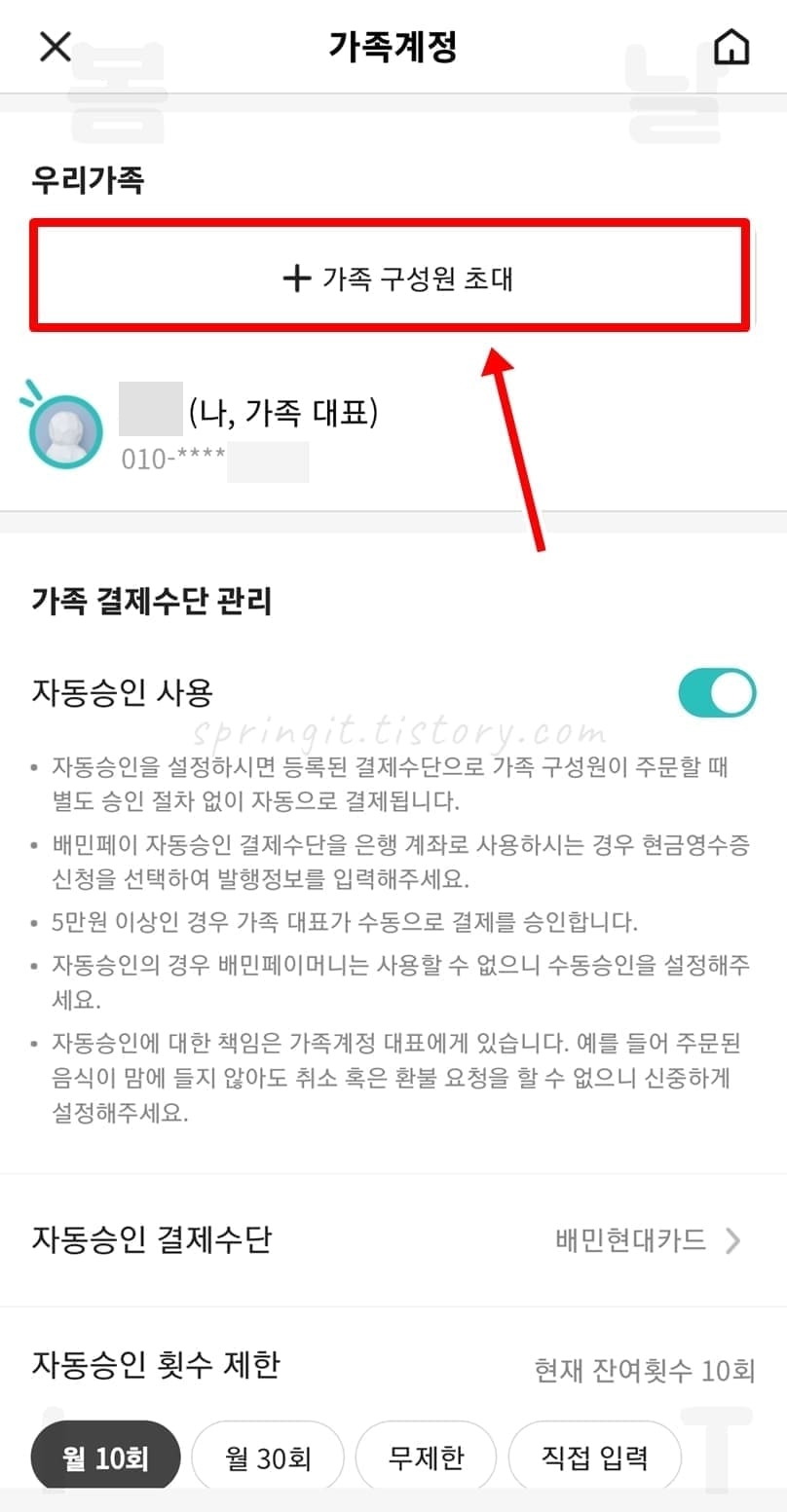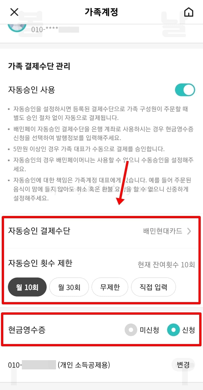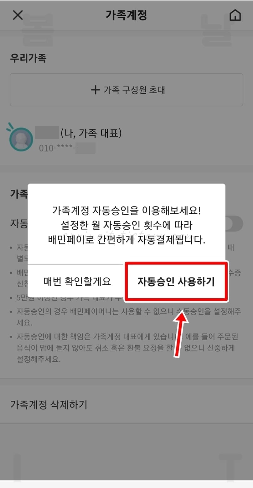 자동승인을 설정하면 등록한 결제수단으로 가족 구성원이 주문할 때 별도 승인 절차없이 자동 결제됩니다. 자동승인을 허용하지 않으면 구성원이 주문할 때마다 승인여부를 선택할 수 있으니 대표자분께서 방식을 선택하시면 되겠습니다. 단 5만원 이상인 경우에는 가족 대표가 수동으로 결제를 승인해야 합니다. 저 같은 경우 매번 승인관리해주기 불편해서 자동승인을 이용하고 있는데 매우 편리하여 사용하시는 것을 추천드립니다.