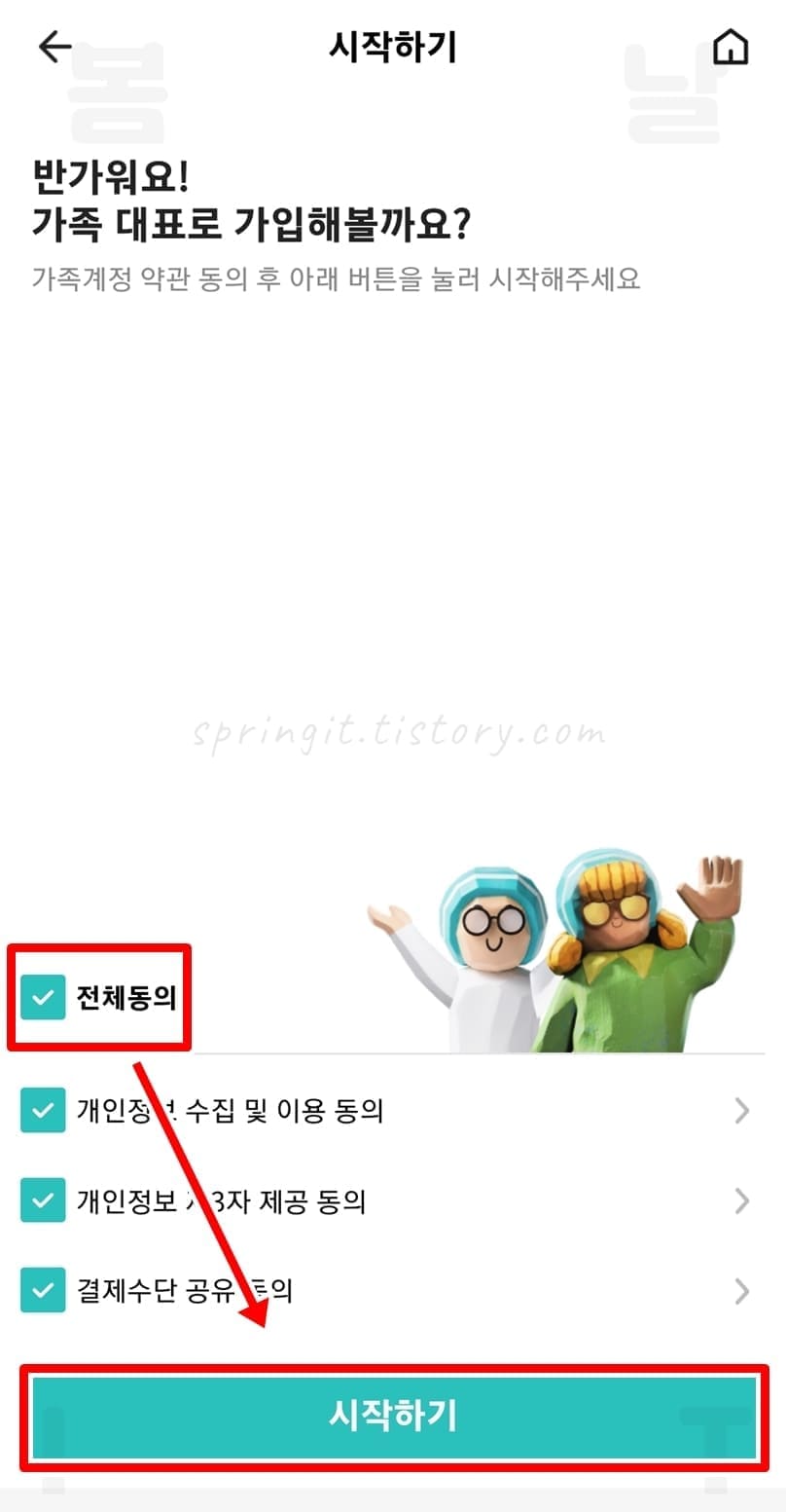 4. 약관에 전체동의 후 시작하기 버튼을 클릭합니다.