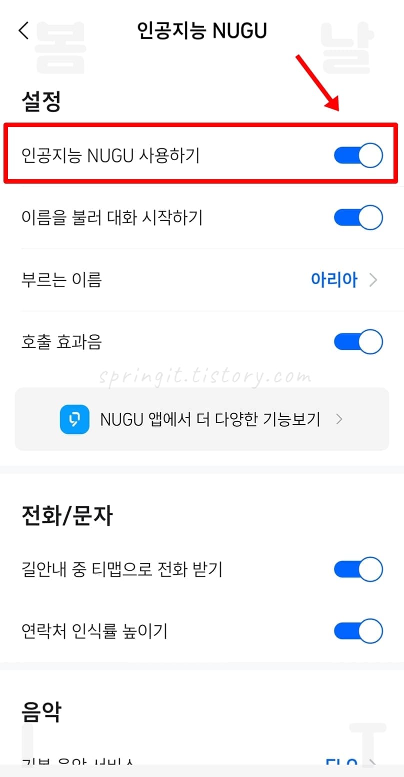 5. 인공지능 NUGU 사용하기 문구 오른쪽 바를 눌러서 OFF 비활성화합니다.