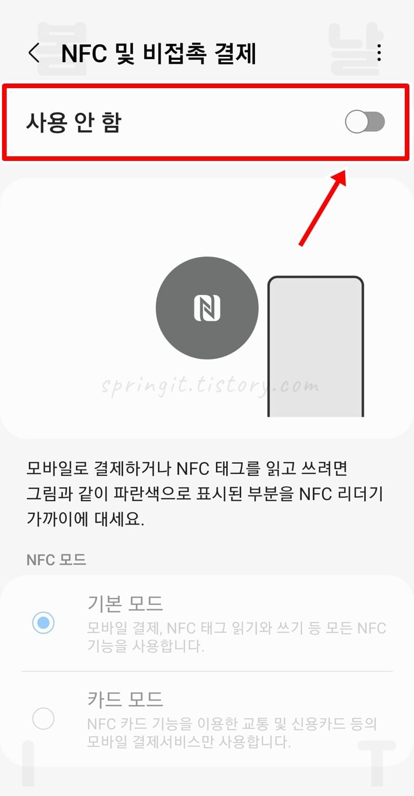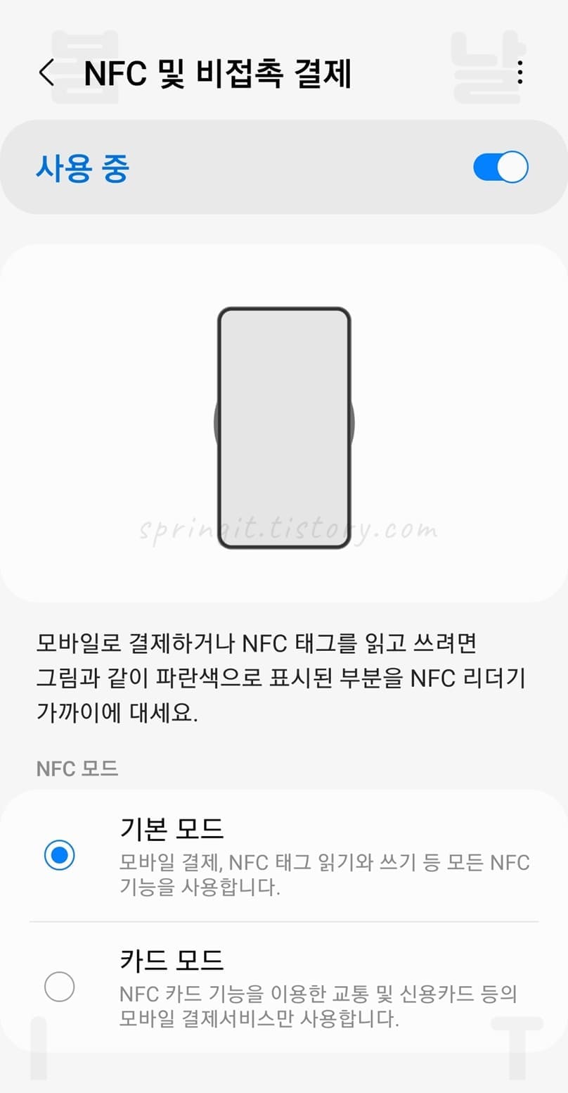 2. 앱 실행 후 연결된 NFC 설정화면에서 기능을 ON으로 켜주세요.