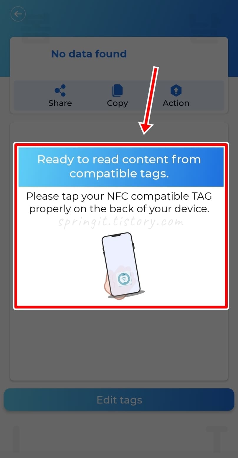 4. NFC 스캔 준비 상태에서 NFC 태그 내장 카드를 접촉시켜봅니다.