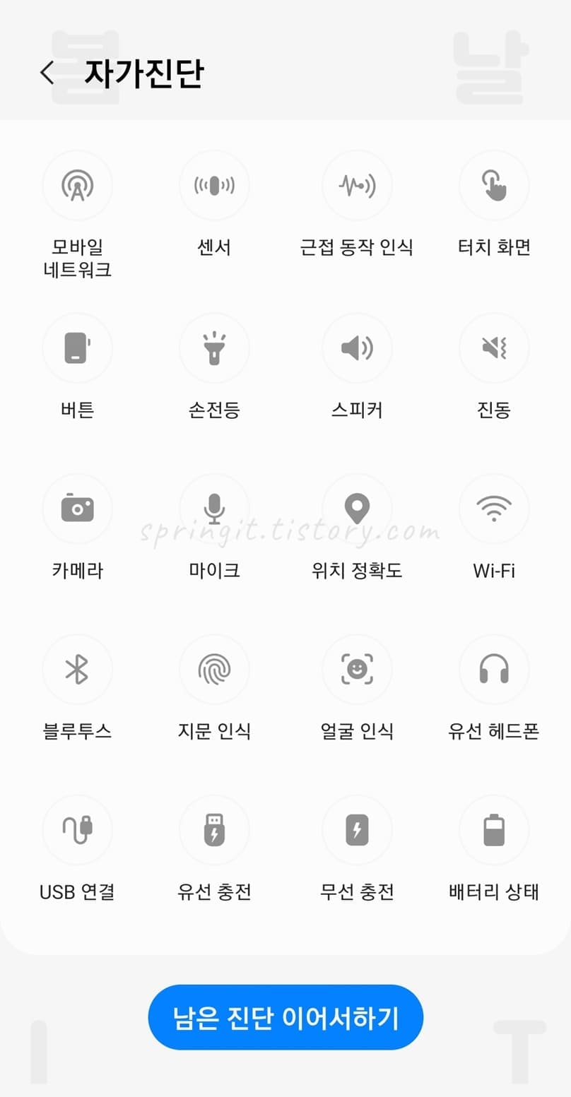 삼성멤버스 자가진단 기능에서는 갤럭시 테스트로 NFC, SIM카드, 기기 재시작 상태, 공식 소프트웨어, 모바일네트워크, 센서, 근접 동작 인식, 터치화면, 버튼, 손전등, 스피커, 진동 카미라, 마이크, 위치 정확도, 와이파이, 블루투스, 지문인식, 얼굴인식, 유선헤드폰, USB연결, 유선충전, 무선충전, 배터리상태 24가지를 제공하고 있습니다. 전체 진단으로 한꺼번에 신속하게 갤럭시의 고장 오류 인식 문제를 테스트해보고 확인할 수 있기에 꼭 전체 진단을 해보시는 것을 추천드립니다.
