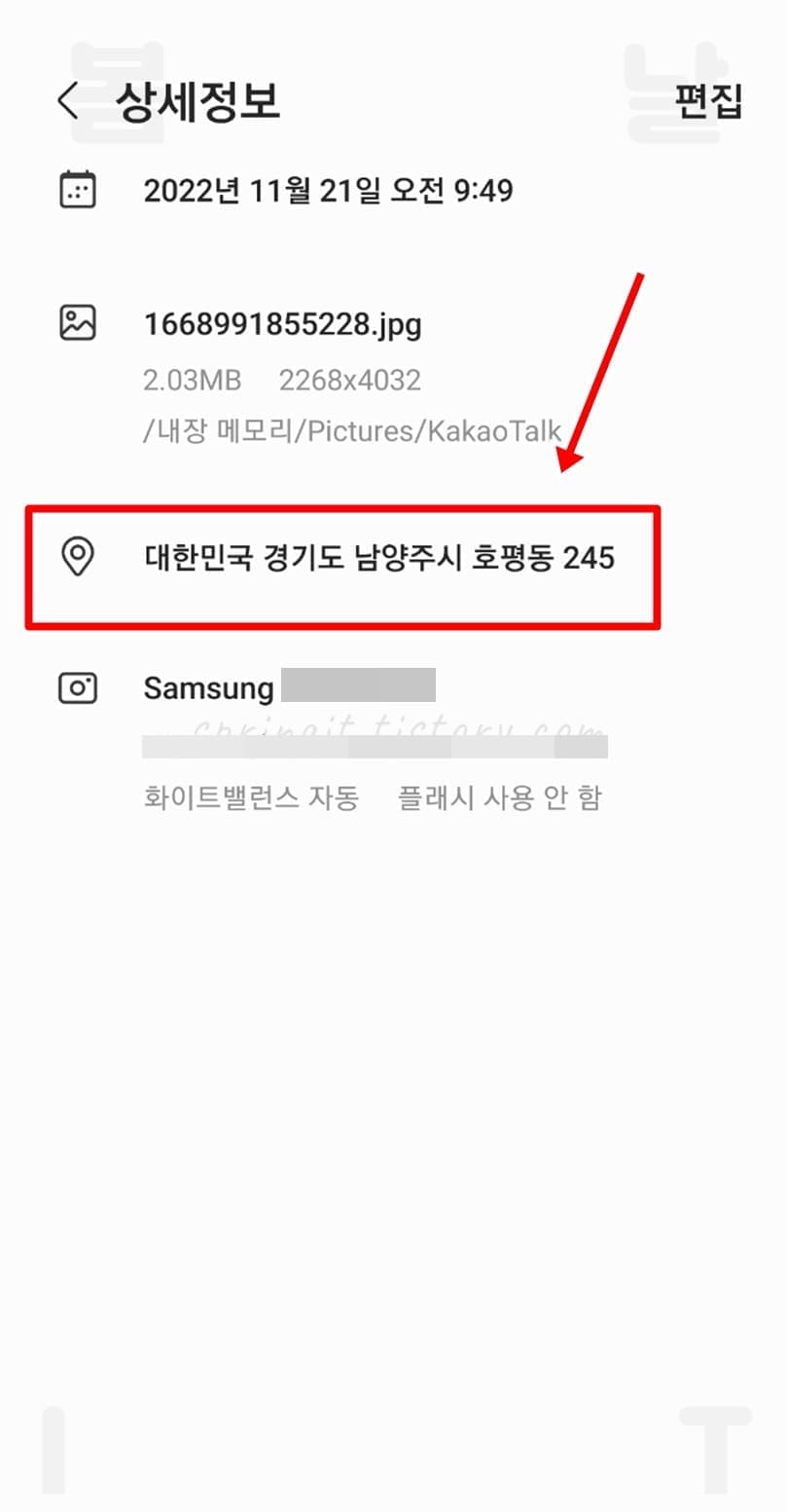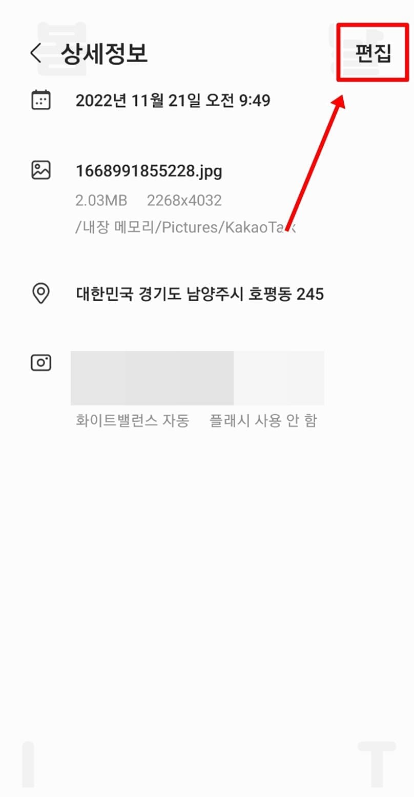 이곳에서 사진안에 들어있는 모든 데이터 정보를 확인할 수 있는데요. 위치정보뿐만 아니라 사진이 촬영된 날짜, 시간, 용량, 촬영 디바이스 이름, 촬영 카메라 설정값까지 볼 수 있습니다.