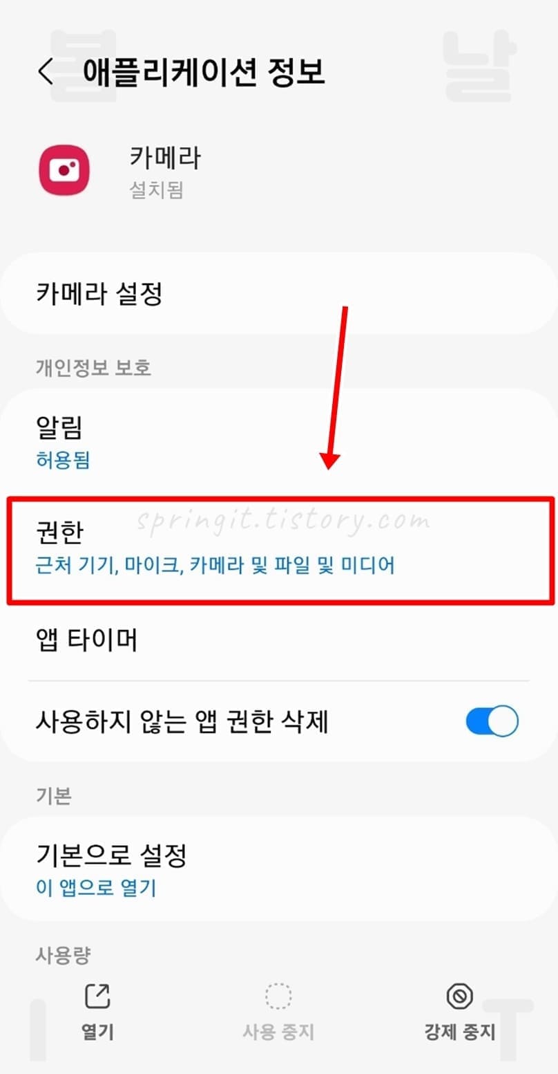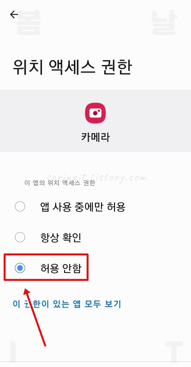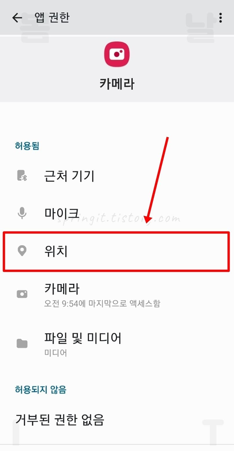 여기까지만 해주셔도 카메라로 촬영한 사진에 위치정보가 들어가지 않습니다만 더 확실하게 하기 위해서 아래 방법을 계속 진행하셔서 카메라 앱의 위치권한을 비허용해주시길 바랍니다.