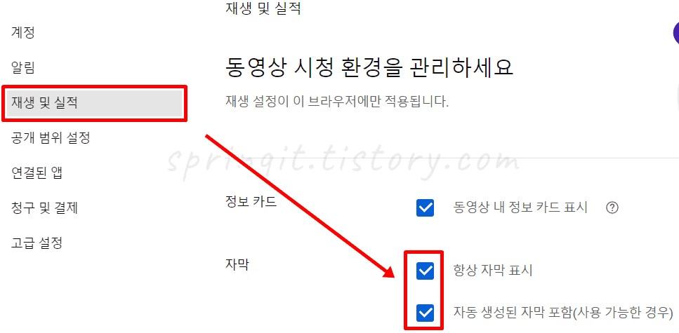 3. 항상 자막 표시 및 자동 생성된 자막 포함을 체크합니다.