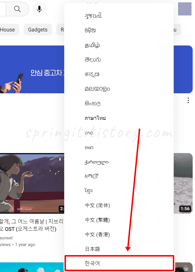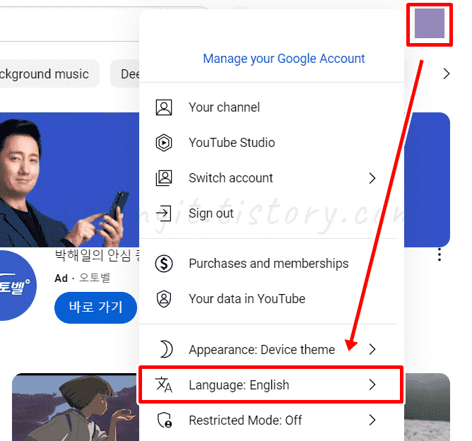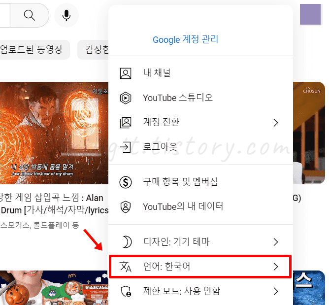 4. 현재 유튜브 언어가 한국어로 설정되었습니다.