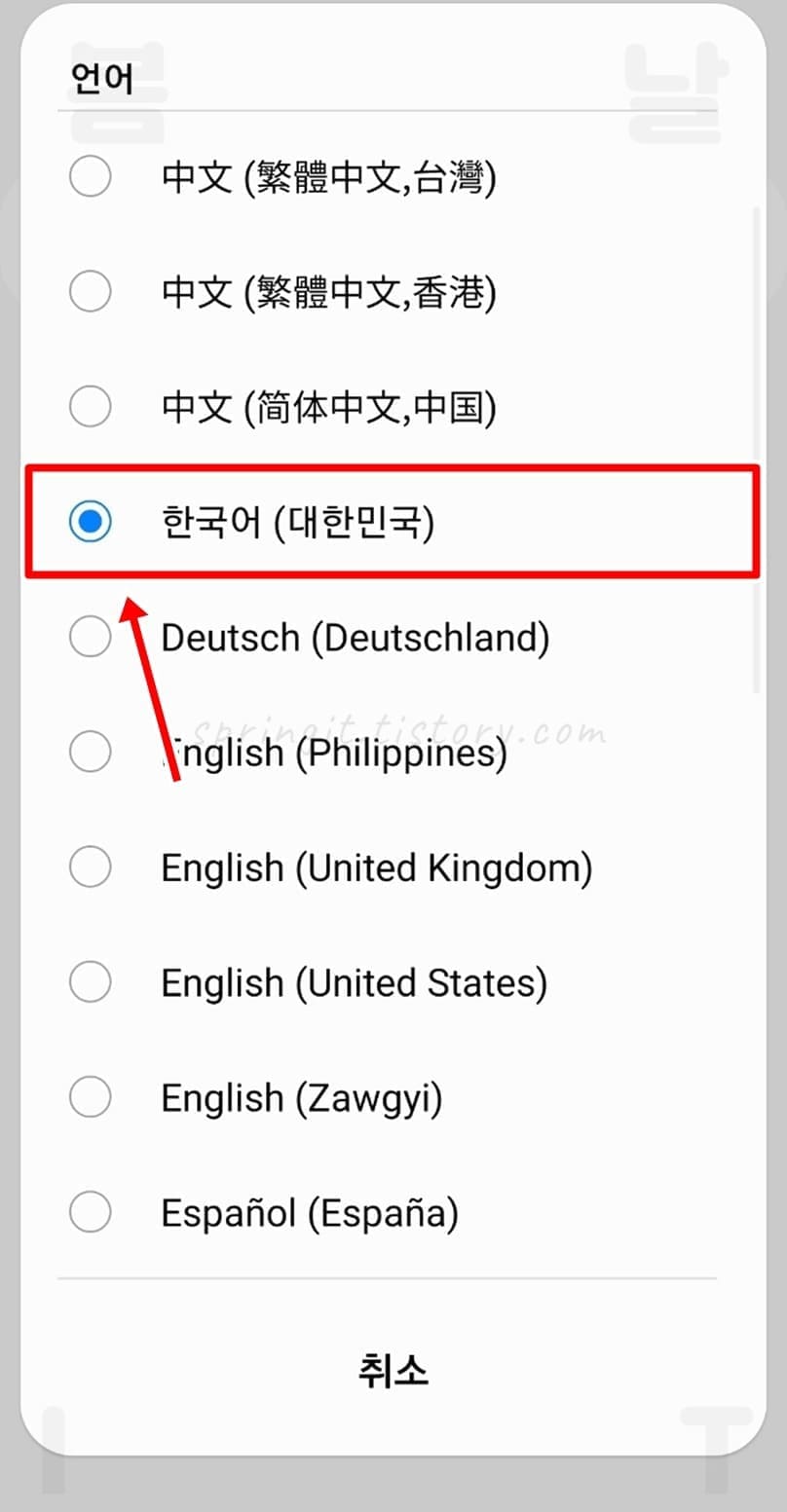 3. 맨 아래에 있는 한국어를 눌러서 선택합니다.