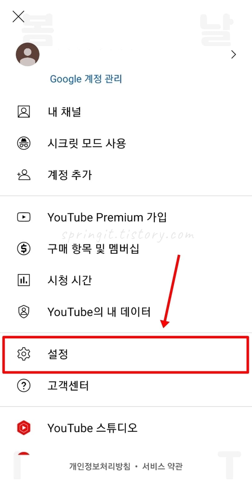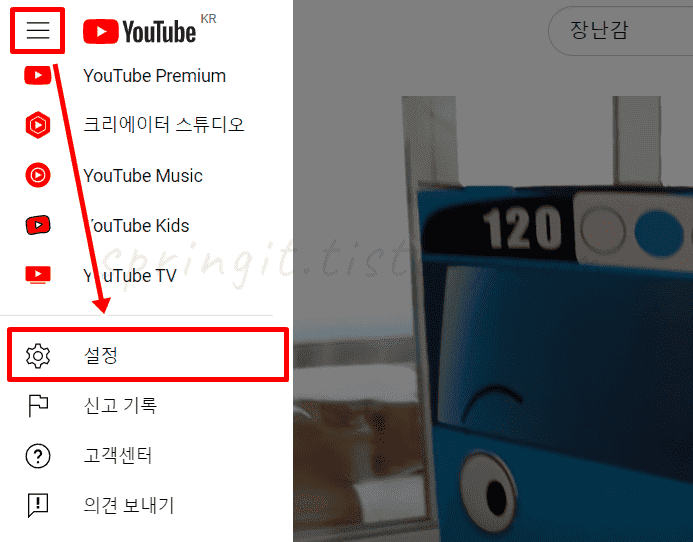 1. PC유튜브에서 좌측 목록 버튼 > 설정을 클릭합니다.