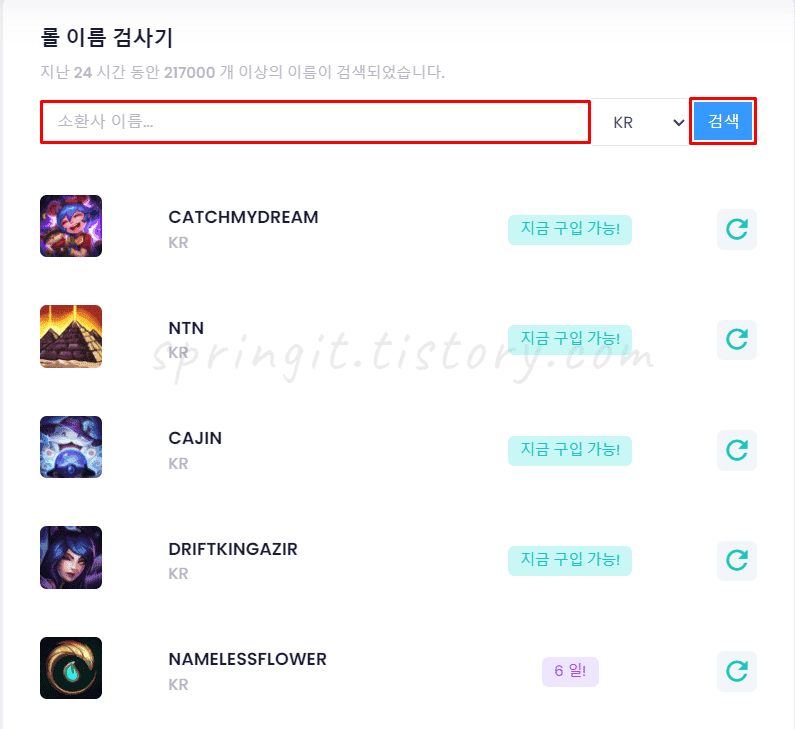 하지만 이것을 직접 계산해서 뺏어오는 것은 사실상 불가능에 가까운데요. 일일히 검색하고 확인하는 것이 상당히 귀찮기 때문입니다. 그래서 롤 닉네임을 뺏기 위한 검색부터 설정가능한 닉네임들을 모두 알려주는 사이트가 있기에 편리하게 사용하시면 됩니다.