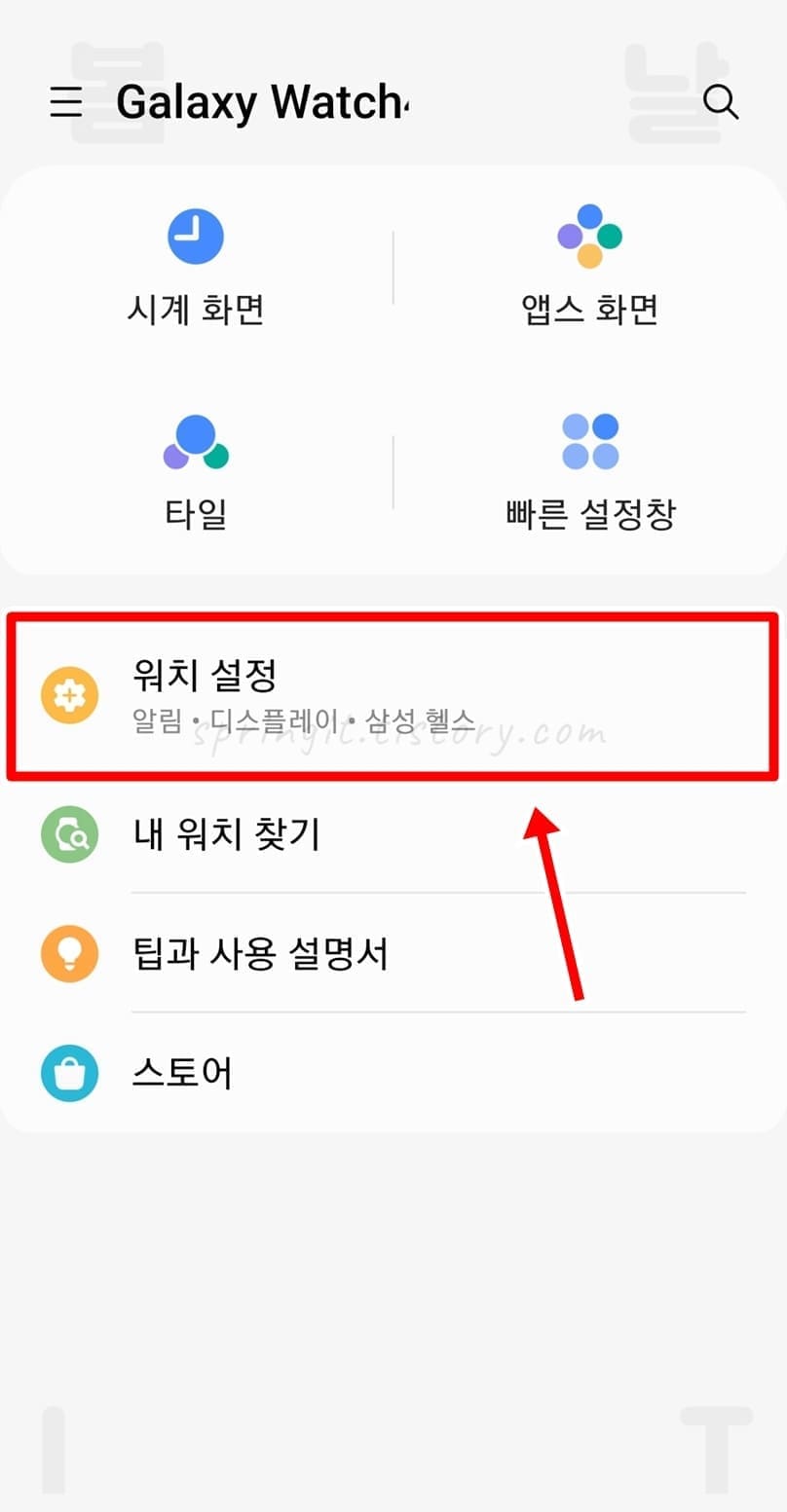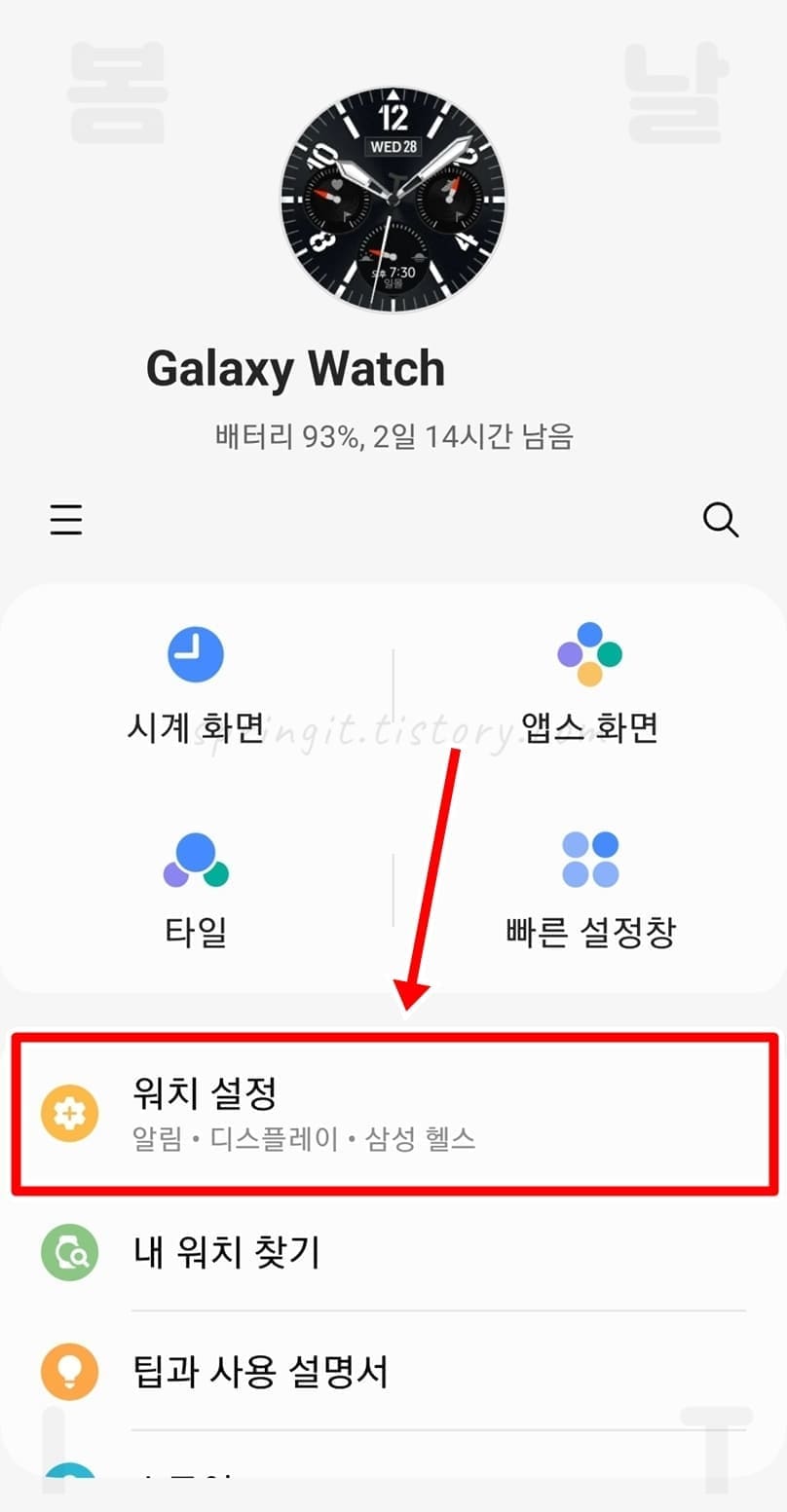 1. 갤럭시 웨어러블 앱에서 워치 설정을 클릭합니다.